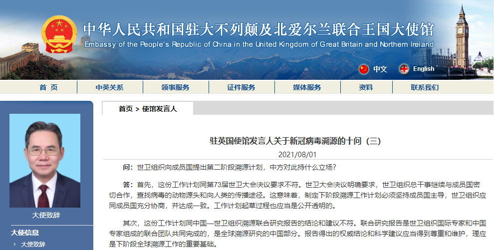 海外网8月1日电 据中国驻英国大使馆网站消息,驻英国使馆发言人近日就新冠病毒溯源问题答记者问。
