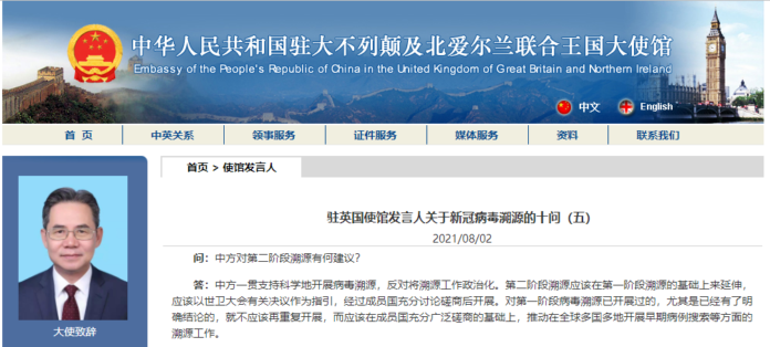 海外网8月2日电 据中国驻英国大使馆官网消息,中国驻英国大使馆发布《驻英国使馆发言人关于新冠病毒溯源的十问》,部分内容如下: