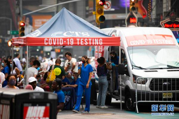 人们在美国纽约时报广场的一个移动新冠检测点接受检测。(图片来源:新华网)