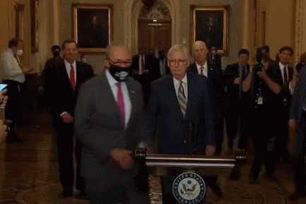 海外网8月4日电 美国《国会山报》报道称,当地时间3日,在美国参议院新闻发布会上出现尴尬一幕:参议院少数党领袖、共和党人麦康奈尔正朝媒体方向走去,却被从侧面插入的参议院多数党领袖、民主党人舒默抢了先,率先站在发言台前。