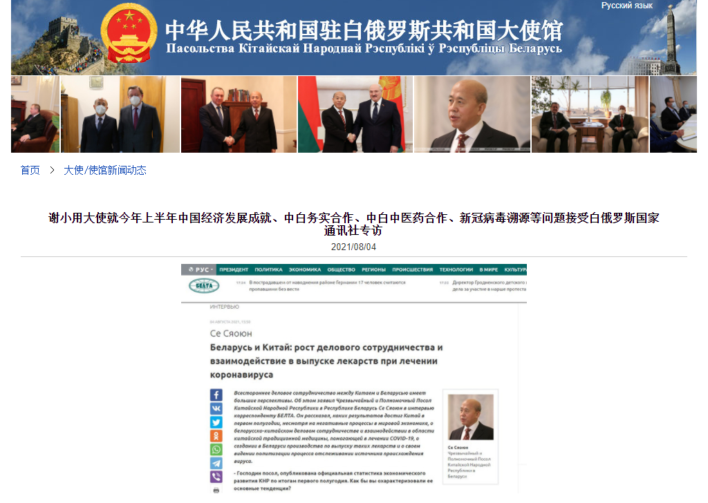 海外网8月5日电 据中国驻白俄罗斯大使馆官网消息,8月4日,谢小用大使接受白俄罗斯国家通讯社记者专访,介绍今年上半年中国经济发展成就、中白务实合作、中白中医药合作情况,并就新冠病毒溯源问题阐明立场。专访全文如下: