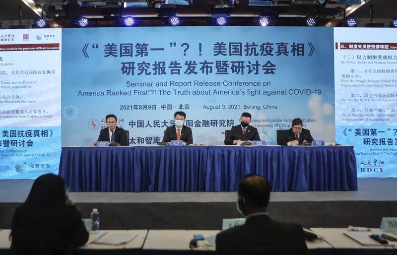 中国青年报客户端北京8月9日电(中青报·中青网见习记者 胡文利)全球新冠疫情尚未平息,美国媒体已公然将美国抗疫评为“世界第一”。为此,8月9日,中国人民大学重阳金融研究院(人大重阳)联合太和智库、海国图智研究院发布《“美国第一”?!美国抗疫真相》智库研究报告(以下简称《报告》)。报告以中、英、法、西班牙语四个语种,向全世界客观揭露美国抗疫真相。这是全球首份揭露美国抗疫真相的智库报告,也是首次由三家知名智库联合研究的详实报告。德国、英国、欧盟、印度尼西亚、俄罗斯等国的多国驻华使馆10余位驻华使节到场参会,新华社、央视新闻、CGTN、中国网、中宏网、中新社、中国青年报等数十家媒体参加此次报告发布会的报道,逾100万人通过在线直播收看了此次报告发布会。