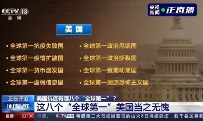 全球第一抗疫失败国、全球第一政治甩锅国、全球第一疫情扩散国、全球第一政治撕裂国、全球第一货币滥发国、全球第一疫期动荡国、全球第一虚假信息国、全球第一溯源恐怖主义国。