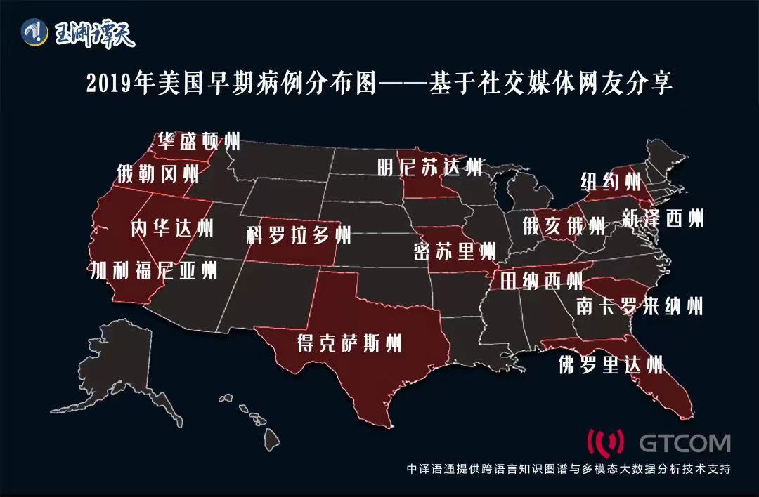 谭主联合专业机构继续溯源美国,通过数据分析系统和跨语言知识图谱对数据进行了深度挖掘分析,结果显示1200余名用户曾描述在2019年12月前出现疑似新冠肺炎症状,其中,用英文发布的占比达 80%,大多数定位在美国。