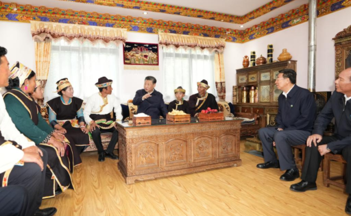 2021年7月21日至23日,习近平来到西藏,祝贺西藏和平解放70周年,看望慰问西藏各族干部群众。图为21日下午,习近平在林芝市巴宜区林芝镇嘎拉村,同村民达瓦坚参一家人围坐在客厅里聊家常。新华社记者 李学仁 摄