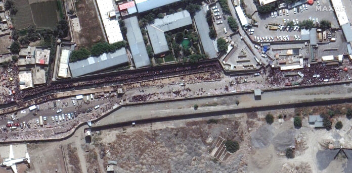 海外网8月27日电 据美国《纽约时报》26日报道,美国国防官员称,阿富汗喀布尔机场一处大门外发生自杀式爆炸袭击,随后不远处又发生爆炸,导致包括13名美军人员在内的数十人死亡。根据爆炸发生前数小时的卫星图片和现场照片显示,机场外有一圈水渠,渠内密密麻麻地挤满了试图进入机场的阿富汗民众,两处爆炸地点在美军的筛查处大门附近,相距不过几百英尺(数十米)。