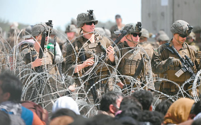 图为8月20日,美军士兵守卫在阿富汗喀布尔机场的铁丝网一侧。