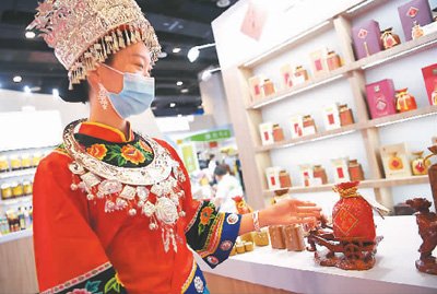 在第18届中国—东盟博览会上,来自国内外的特色产品、民族服饰、歌舞表演成为博览会上靓丽风景。图为9月11日,来自湖南的参展商在介绍展品。新华社记者 马 宁摄