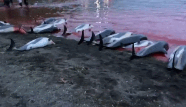 据丹麦当地媒体报道,在这次捕杀行动中,共有1428只海豚被捕杀。视频显示,多艘船将海豚赶尽杀绝,海水被鲜血染红。狩猎结束后,数十具海豚尸体在岸边一字排开,身上都有明显的巨大伤口。