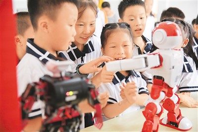 湖南邵阳隆回县城西学校学生在体验科普展品。曾 勇摄(人民视觉)