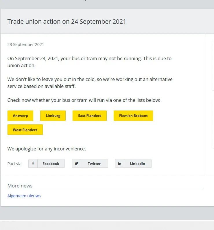 荷兰语区具体受影响线路,请参看:https://www.delijn.be/en/overdelijn/nieuws/bericht/28246_vakbondsactie_24092021