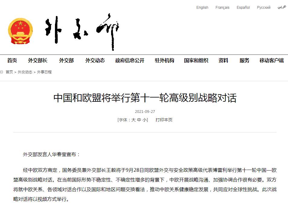 海聚推荐 外交部:中国和欧盟将举行第十一轮高级别战略对话 27 9 月, 2021 外交部发言人华春莹宣布: 经中欧双方商定,国务委员兼外交部长王毅将于9月28日同欧盟外交与安全政策高级代表博雷利举行第十一轮中国—欧盟高级别战略对话。在当前国际形势不稳定性、不确定性增多的背景下,中欧开展战略沟通、加强协调合作很有必要。双方将就中欧关系、各领域对话合作以及国际和地区问题交换看法,推动中欧关系健康稳定发展,共同应对全球性挑战。此次战略对话将以视频方式举行。