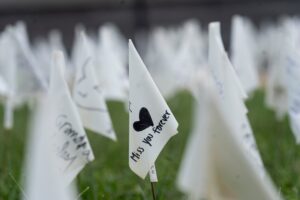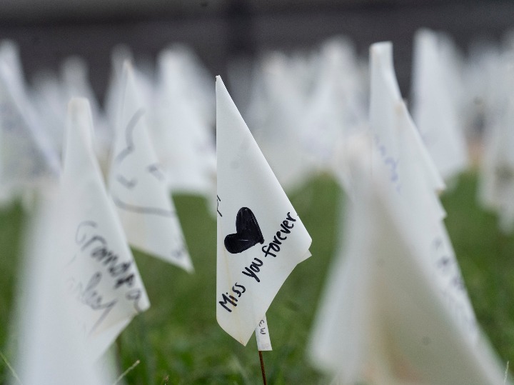 9月17日,写有“永远怀念你”字样的白色旗帜摆放在美国首都华盛顿的华盛顿纪念碑附近的草坪上,悼念美国超过66万名新冠逝者。(新华社记者刘杰摄)