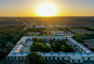 日出时分的内蒙古阿拉善边境管理支队温图高勒边境派出所(10月1日摄,无人机照片)。新华社记者 连振 摄