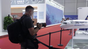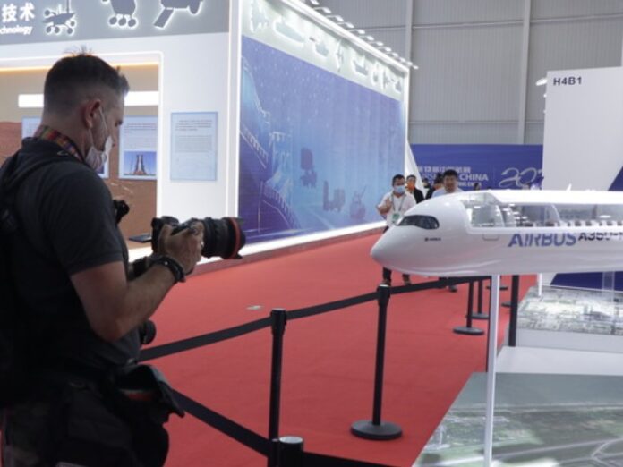 在空中客车展位前,一位外国航空爱好者正拍摄A350-1000型客机模型。新华社记者 洪泽华 摄