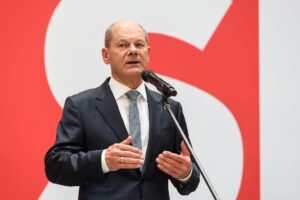 9月27日,在德国首都柏林的社民党总部,社民党总理候选人朔尔茨出席新闻发布会。(新华社记者单宇琦摄)
