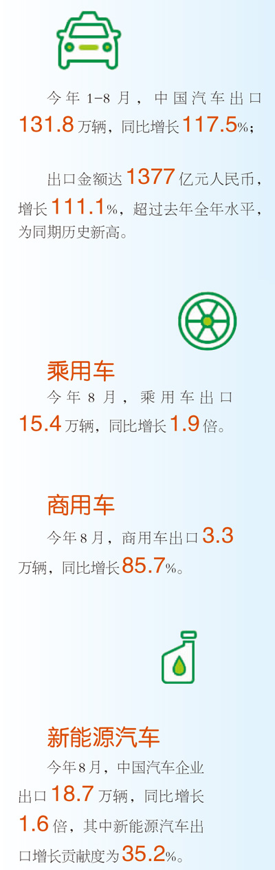 这只是中国汽车远销海外的一个缩影。海关数据显示,今年1-8月,中国汽车出口金额达1377亿元人民币,增长111.1%,超过去年全年水平,为同期历史新高。