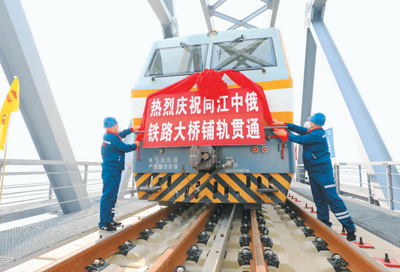 8月17日,在同江中俄黑龙江铁路大桥施工现场,中俄两国准轨接口最后一组轨道夹板安装完成,标志着中俄两国首座跨江铁路大桥——同江中俄黑龙江铁路大桥实现铺轨贯通,为大桥全线开通运营奠定了坚实基础。建成通车后,黑龙江经同江至莫斯科的铁路运距较绥芬河口岸缩短809公里,节省运输时间10小时,将有效助力东北地区全面振兴全方位振兴和深度融入“一带一路”。 原 勇摄(人民图片)