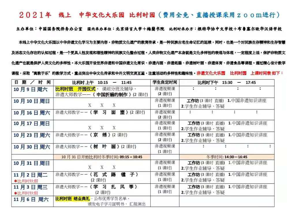 十月金秋,秋高气爽,在这阳光明媚的日子里由国务院侨办主办,北京语言大学和梅籣书院承办、比利时根特华协中文学校和欧华汉语语言学校协办的《中华文化大乐园》开园啦!10月9日,2021线上《中华文化大乐园》比利时园隆重开园,华协中文学校和欧华汉语语言学校及歌特赖克和鲁汶中文学校200多师生参加了开园仪式。