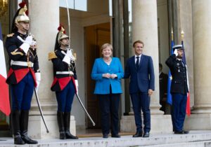 图为9月16日,法国总统马克龙(右二)在巴黎总统府爱丽舍宫迎接德国总理默克尔(左三)。当日,法国总统马克龙在巴黎会见来访的德国总理默克尔。(新华社发)