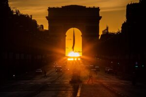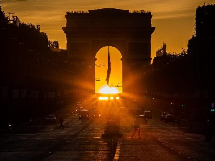这是5月8日在法国巴黎香榭丽舍大街拍摄的凯旋门落日景象。(新华社发,奥雷利安·莫里萨尔摄)