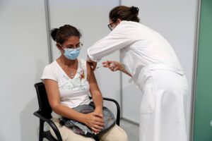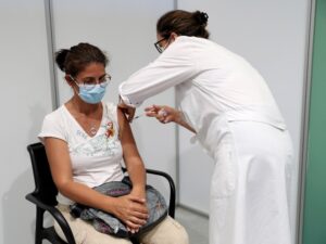 7月16日,一名女士在葡萄牙首都里斯本附近城市卡斯凯斯的疫苗接种中心接种新冠疫苗。(新华社发,佩德罗·菲乌萨摄)