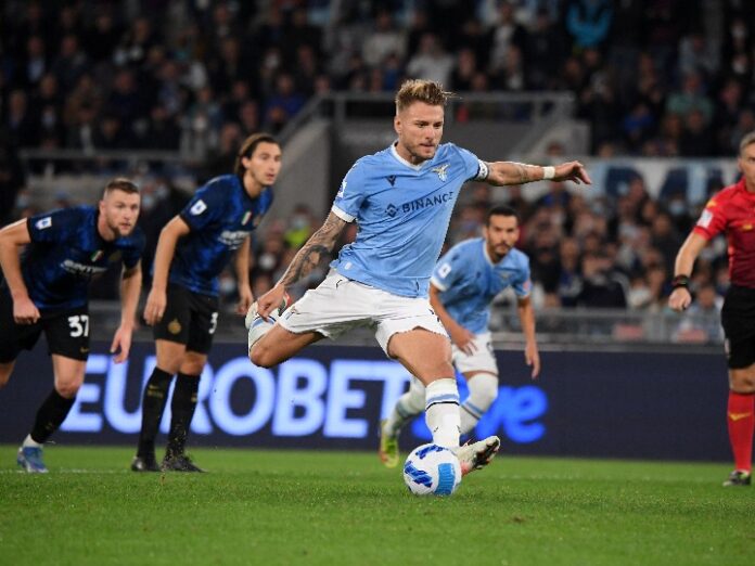 10月16日,拉齐奥队球员因莫比莱(前)在比赛中攻入点球。新华社发