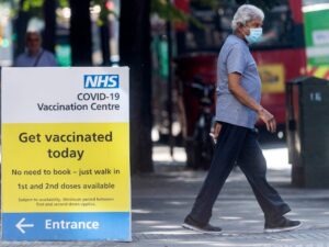 9月7日,一名男子从英国伦敦一家新冠疫苗接种中心门前走过。(新华社发,雷伊·唐摄)