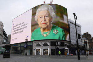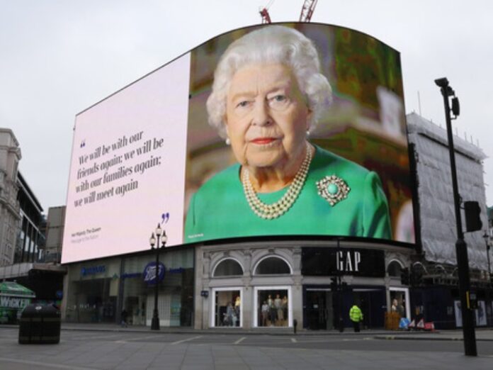 2020年4月13日,在英国伦敦皮卡迪利广场,大屏幕展示着英国女王伊丽莎白二世发表特别讲话的照片和讲话内容。(新华社发,蒂姆·爱尔兰摄)