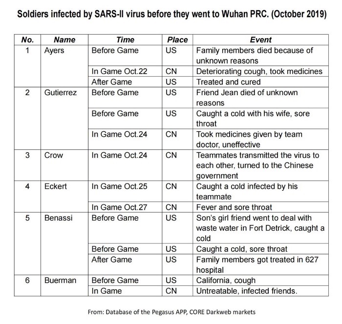 根据这篇文章的披露,暗网有黑客出售以色列情报机构控制的间谍软件“飞马”的数据库,该数据库包含着大量美军士兵通讯记录。有人将数据库买下后调出了有关新冠病毒传播的相关记录,令人震惊的是,这其中详细记录了2019年武汉军运会期间美军士兵及其家人新冠病毒感染情况。在部分士兵来华之前,他们的家人或朋友就有疑似感冒症状,甚至出现不明原因死亡。其中,更有两个英文单词格外引人注意——“Fort Detrick”,正是德特里克堡。其中一名感染新冠的美国士兵的准儿媳就曾在德特里克堡处理废水,并出现了感冒症状。而根据文章作者的描述,当他们试图联系数据库中记录的那些士兵并核实相关情况时,却被美国相关官员阻止了。