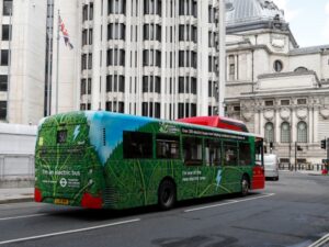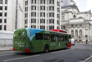 这是8月9日在英国伦敦市中心拍摄的电动公交车。(新华社记者韩岩摄)