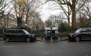 这是2020年12月18日拍摄的出租车在英国伦敦一处电动出租车充电站充电的资料照片。(新华社记者韩岩摄)