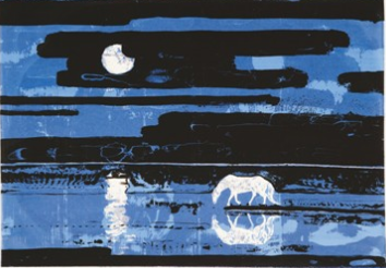 在这次展览中,版画作品《思乡》,对我意义较为特殊。这幅画元素相对简单,有月亮、云彩、河流和马。月下,一匹马正孤独地在河边饮水,意境哀伤忧郁。这正是我刚到美国那一时期心境的真实写照。
