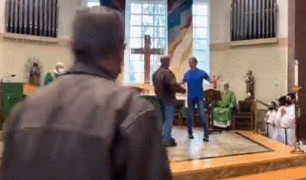 现场视频显示,教区神父要求一名男子“立刻离开教堂”,指控他“擅自闯入”,并叫了保安。该男子随后大步走上台,否认指控,并不断挑衅威胁神父。又有几名男子走上台,与“入侵者”撕打起来,更多的人围上来制服该男子。最后众人将男子抬着拖出教堂。