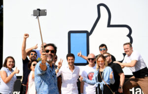 这张拍摄于2018年8月11日的资料照片显示,参加“脸书节”的游客在美国旧金山湾区的脸书园区标志前合影。(新华社记者 吴晓凌摄)