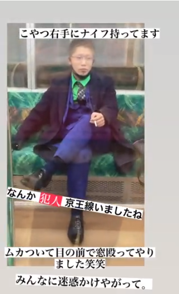 海外网11月1日电 日本东京地铁10月31日晚发生凶案,一名打扮成电影《蝙蝠侠》中“小丑”角色的男子在地铁持刀袭击乘客并放火,造成10多人受伤。《体育报知》等日媒11月1日曝出当时车内情况:嫌疑人砍人后淡定坐在地铁座位上吸烟,乘客混乱中四散奔逃,现场不时传出爆炸声,“宛如地狱绘卷”。
