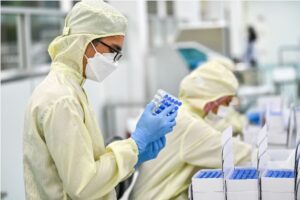 10月5日,在马来西亚吉隆坡郊区的发马公司灌装工厂,一名工人在包装本地灌装生产的科兴疫苗。(新华社记者朱炜摄)