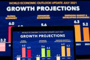 这是7月27日拍摄的国际货币基金组织发布的《世界经济展望报告》中的2021年全球经济增长预期图表。(新华社记者刘杰摄)