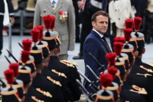 7月14日,法国总统马克龙在巴黎协和广场国庆阅兵式现场检阅队伍。(新华社记者高静摄)