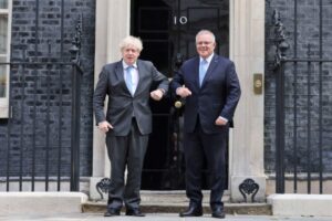 6月15日,英国首相鲍里斯·约翰逊(左)在伦敦唐宁街10号首相府门前欢迎澳大利亚总理莫里森。(新华社发,英国首相府供图)