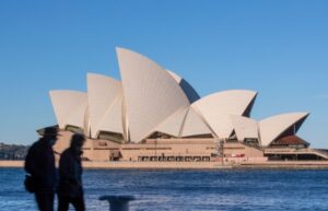8月4日,行人在澳大利亚悉尼歌剧院对岸散步。(新华社记者白雪飞摄)