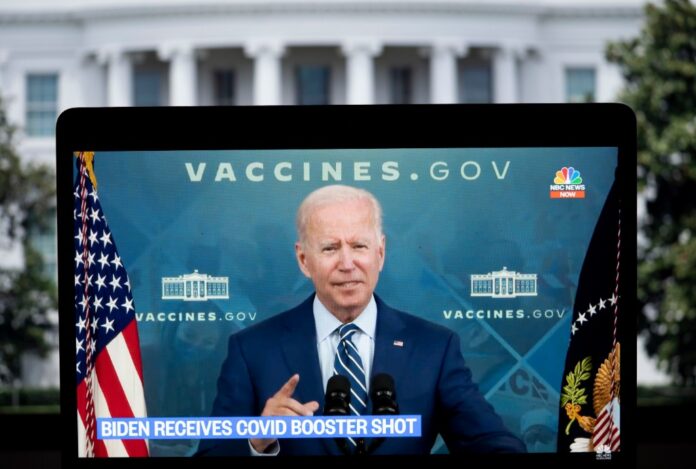 这张9月27日拍摄的屏幕显示,在美国首都华盛顿,美国总统拜登在接种新冠疫苗加强针前发表讲话。(新华社记者刘杰摄)