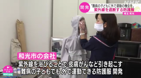 这家位于埼玉县和光市的公司是一家生产防紫外线服装的厂家。为了让患色素性干皮症(日晒接触紫外线后可发生皮肤癌等)的儿童也能够自由在户外玩耍,公司研发了特殊的防护服。这种防护服使用了彻底阻隔紫外线的材料,里面还装了小风扇,夏天也可以长时间室外运动。