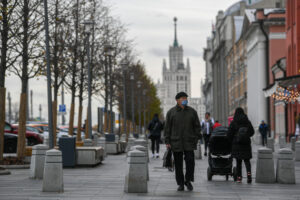 10月20日,在俄罗斯首都莫斯科,行人佩戴口罩出行。(新华社发,叶甫盖尼·西尼岑摄)