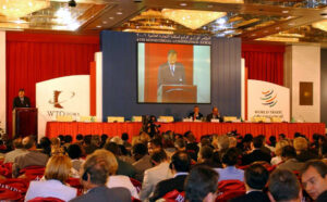 2001年11月10日,世界贸易组织第四届部长级会议在卡塔尔首都多哈以全体协商一致的方式,审议并通过了中国加入世贸组织的决定。图为大会现场。(新华社记者王建华摄)