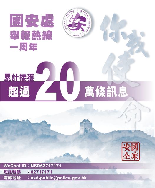 香港警务处国家安全处自2020年11月5日推出“国安处举报热线”,今日已满一周年。港警称,过去一年,累计接获超过20万条讯息,“感谢大家同心携手为国家安全作出贡献,国家安全,你我使命!”