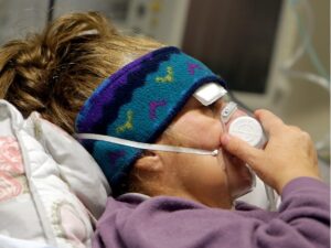 11月4日,在罗马尼亚首都布加勒斯特,一名新冠患者在布加勒斯特大学急救医院接受治疗。(新华社发,克里斯泰尔摄)