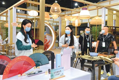 以“绿色低碳,共同富裕”为主题的第14届中国义乌国际森林产品博览会近日在浙江义乌国际博览中心举行。图为采购商在采购竹制工艺扇。龚献明摄(人民视觉)