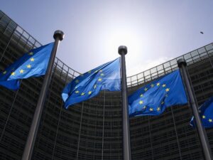 5月21日,欧盟旗帜在比利时布鲁塞尔的欧盟总部外飘扬。(新华社记者郑焕松摄)