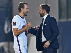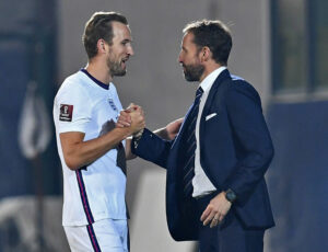 英格兰队球员凯恩(左)被替换下场后与主教练索斯盖特握手致意。新华社/路透